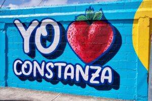 El primero de los murales, ubicado en la alcaldía municipal, celebra la identidad de Constanza con una colorida representación de sus paisajes, producción agrícola y lugares tradicionales.