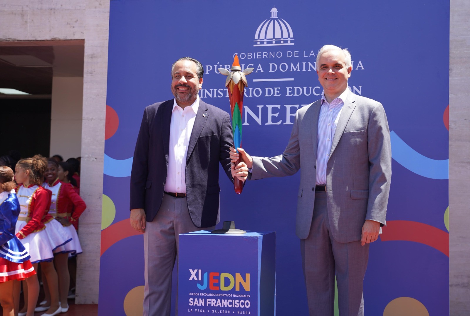 La antorcha fue recibida por los atletas escolares Omar José Marte Rosario e Isabel Fernández Paulino, ambos pertenecientes a la Regional 15 de Santo Domingo, quienes tendrán el honor de iniciar su recorrido por distintas provincias del país, llevando el mensaje de unidad, esfuerzo y superación que promueven los Juegos Escolares.