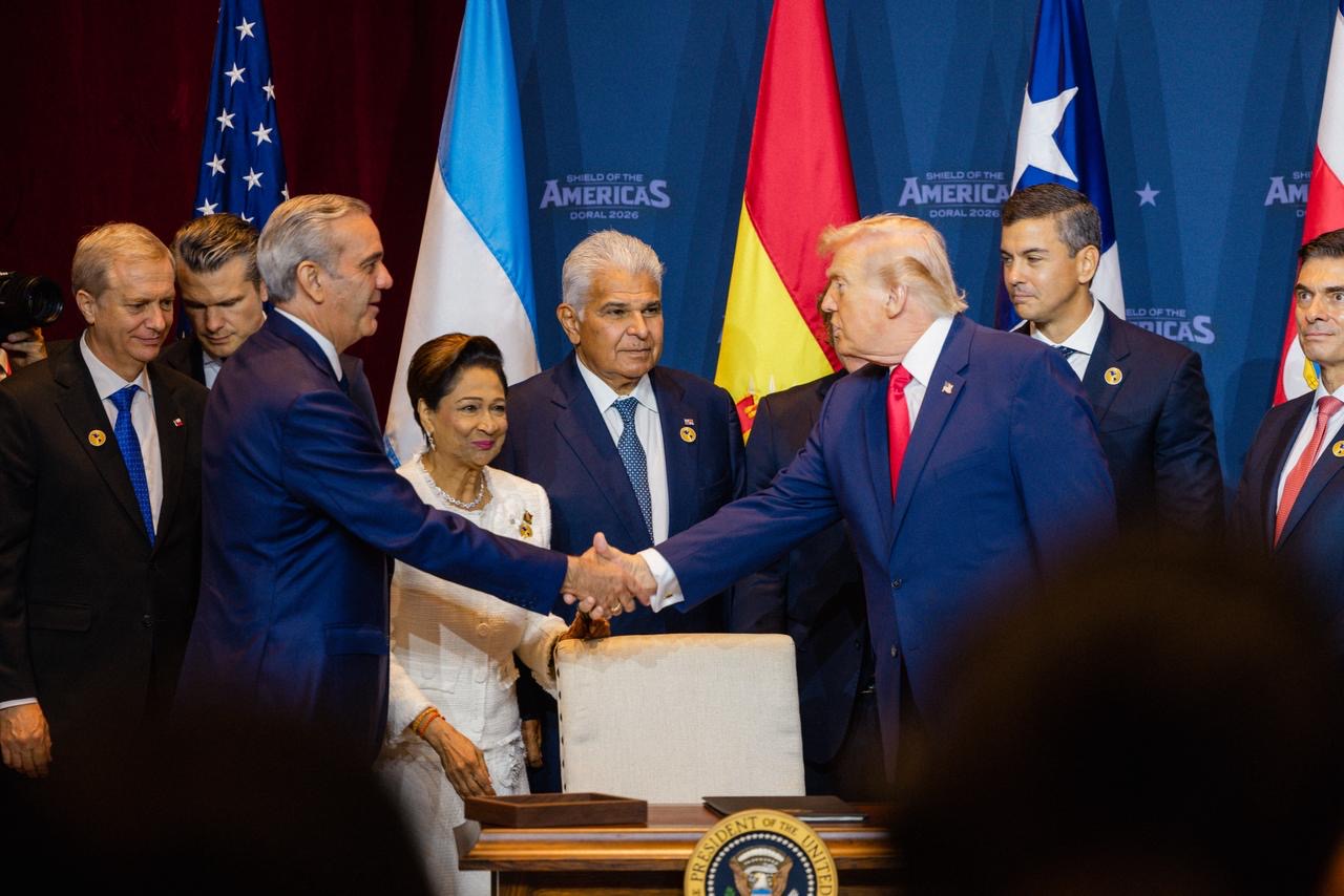 Miami, Florida. – El presidente de la República Dominicana, Luis Abinader, participó este sábado junto a otros mandatarios del hemisferio en la firma de una proclamación para la creación de una coalición militar regional destinada a combatir los cárteles del narcotráfico, durante la cumbre denominada “Escudo de las Américas”.