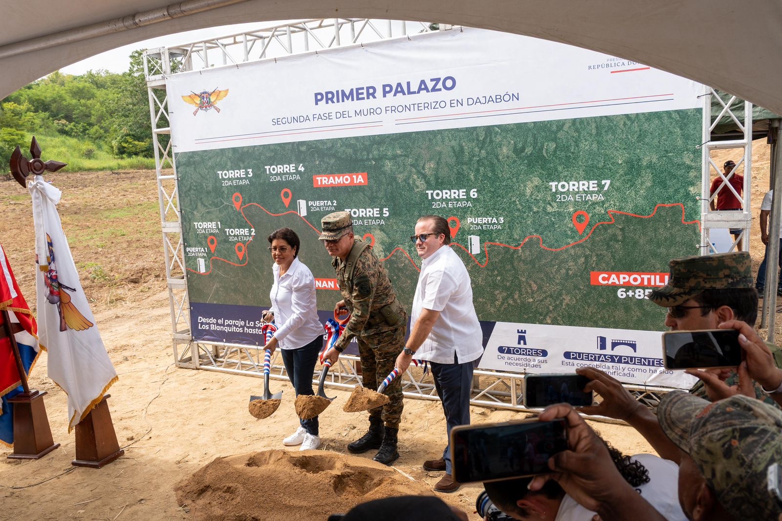 Dajabón, 20 de junio de 2025.–El ministro de la Presidencia, José Ignacio Paliza, y el ministro de Defensa, teniente general, Carlos Antonio Fernández Onofre, ERD, encabezaron el acto simbólico del primer palazo que marca el inicio de la construcción de la segunda fase de la verja perimetral fronteriza inteligente, como parte del plan estratégico del Gobierno dominicano para fortalecer la seguridad nacional y garantizar un mayor control del territorio.