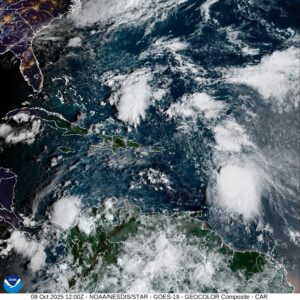 El Indomet indicó que, por su posición geográfica, continúa monitoreando la tormenta tropical Jerry, localizada a unos 640 km al este/sureste de las Antillas Menores, con vientos máximos sostenidos de 100 km/h y desplazamiento hacia el oeste/noroeste a unos 31 km/h.