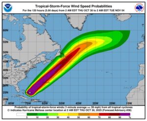 El Indomet precisó que el huracán Melissa, ahora de categoría 2 en la escala de Saffir-Simpson, se localiza aproximadamente a 345 km al noreste del centro de las Bahamas, moviéndose hacia el nor/noreste a unos 33 km/h. Mantiene vientos máximos sostenidos de 165 km/h y ráfagas superiores.